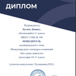 В декабре 2020 г. учащиеся МБОУ СОШ № 196 приняли участие в Диктанте по английскому языку среди обучающихся организаций высшего образования и общеобразовательных организаций Российской Федерации (организатор Казанский федеральный университет). Подготовкой учащихся к конкурсу занималась учитель английского языка Буйнакова Жанна Игоревна.