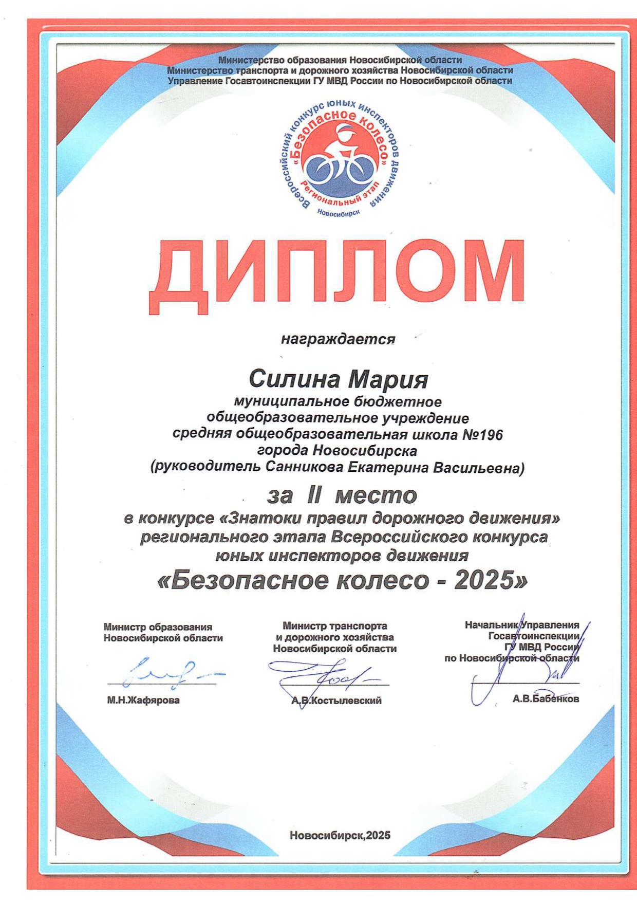 Силина Мария-🥈2 место в конкурсе «Знатоки ПДД».
