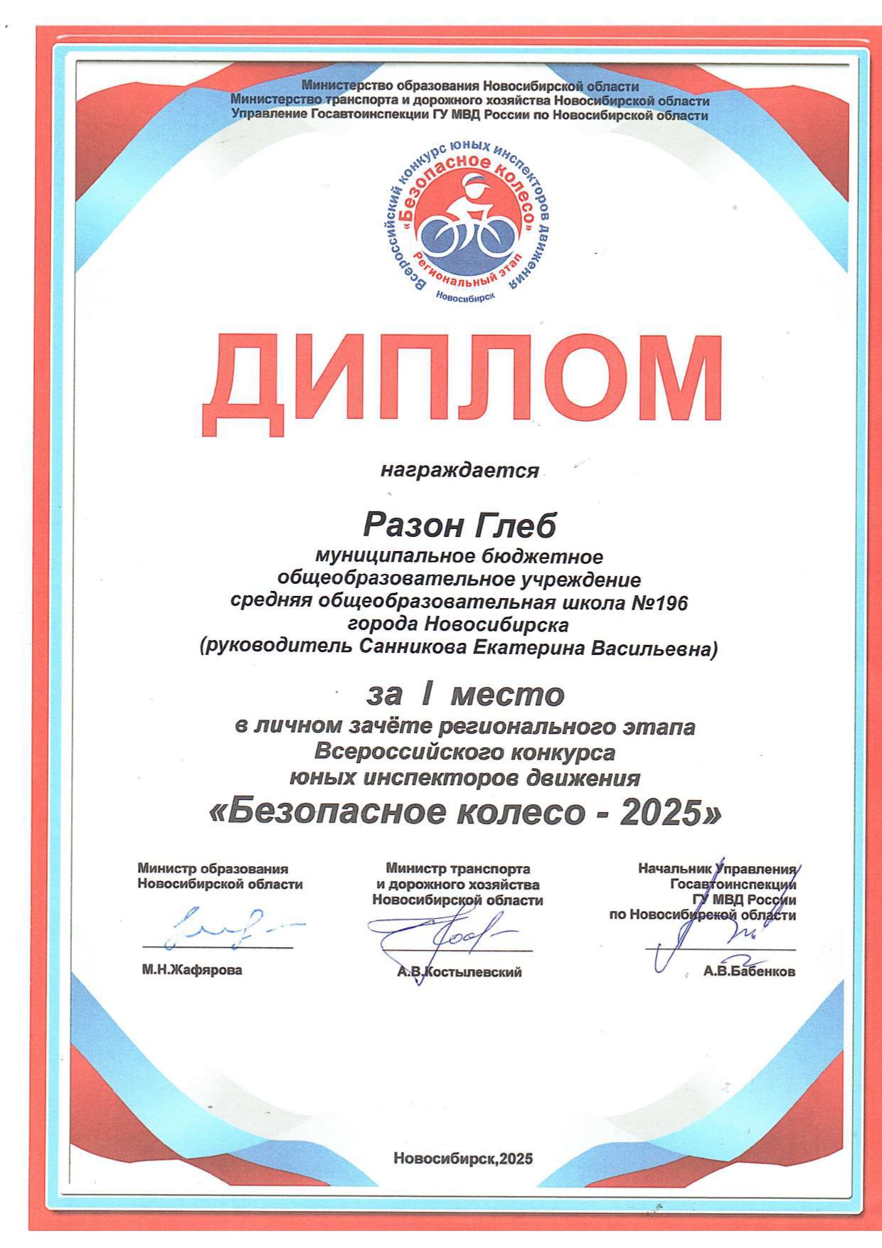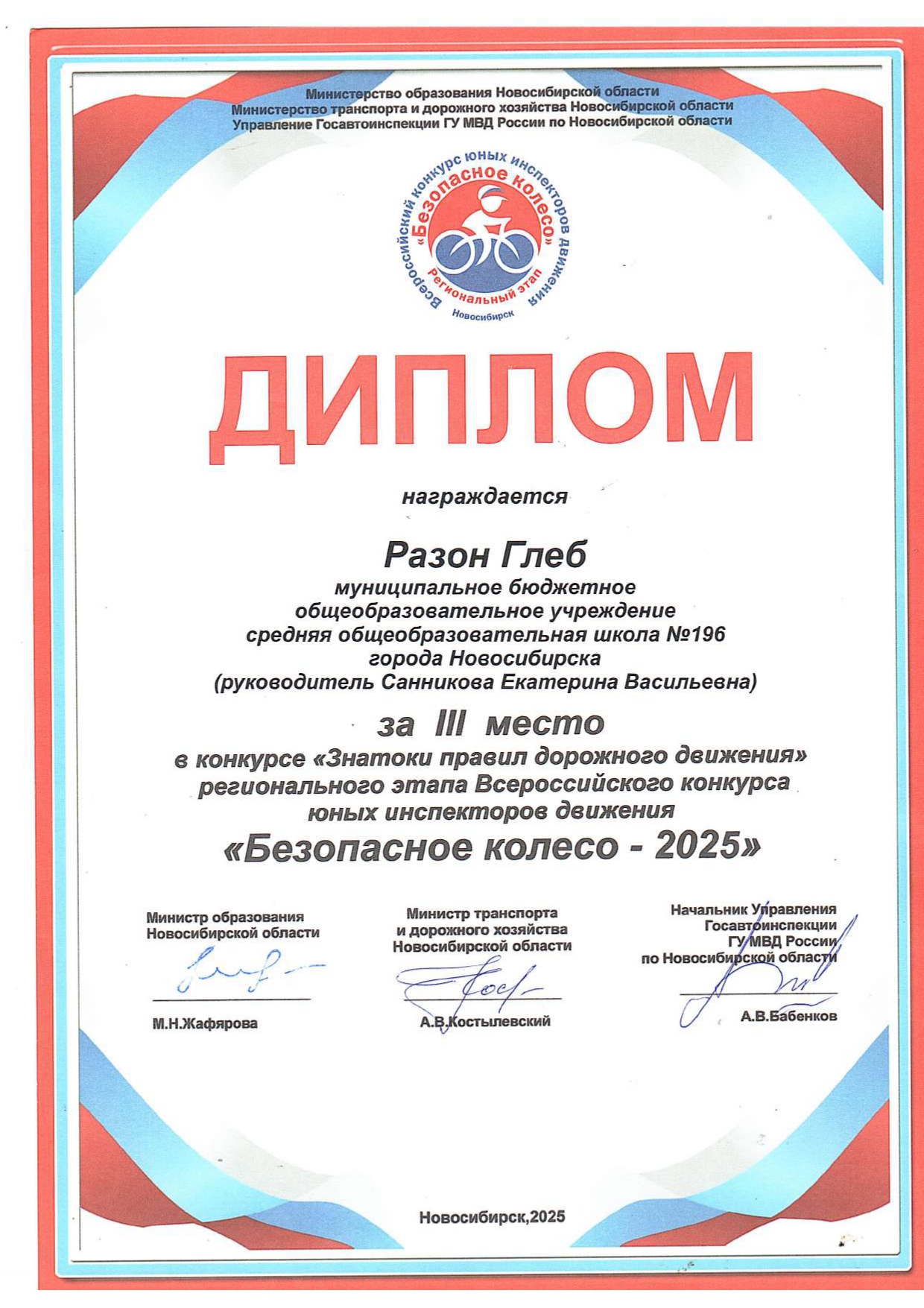 Разон Глеб занял 🥇1 место в личном зачёте по всем номинациям среди мальчиков и 🥉3 место в конкурсе «Знатоки ПДД».